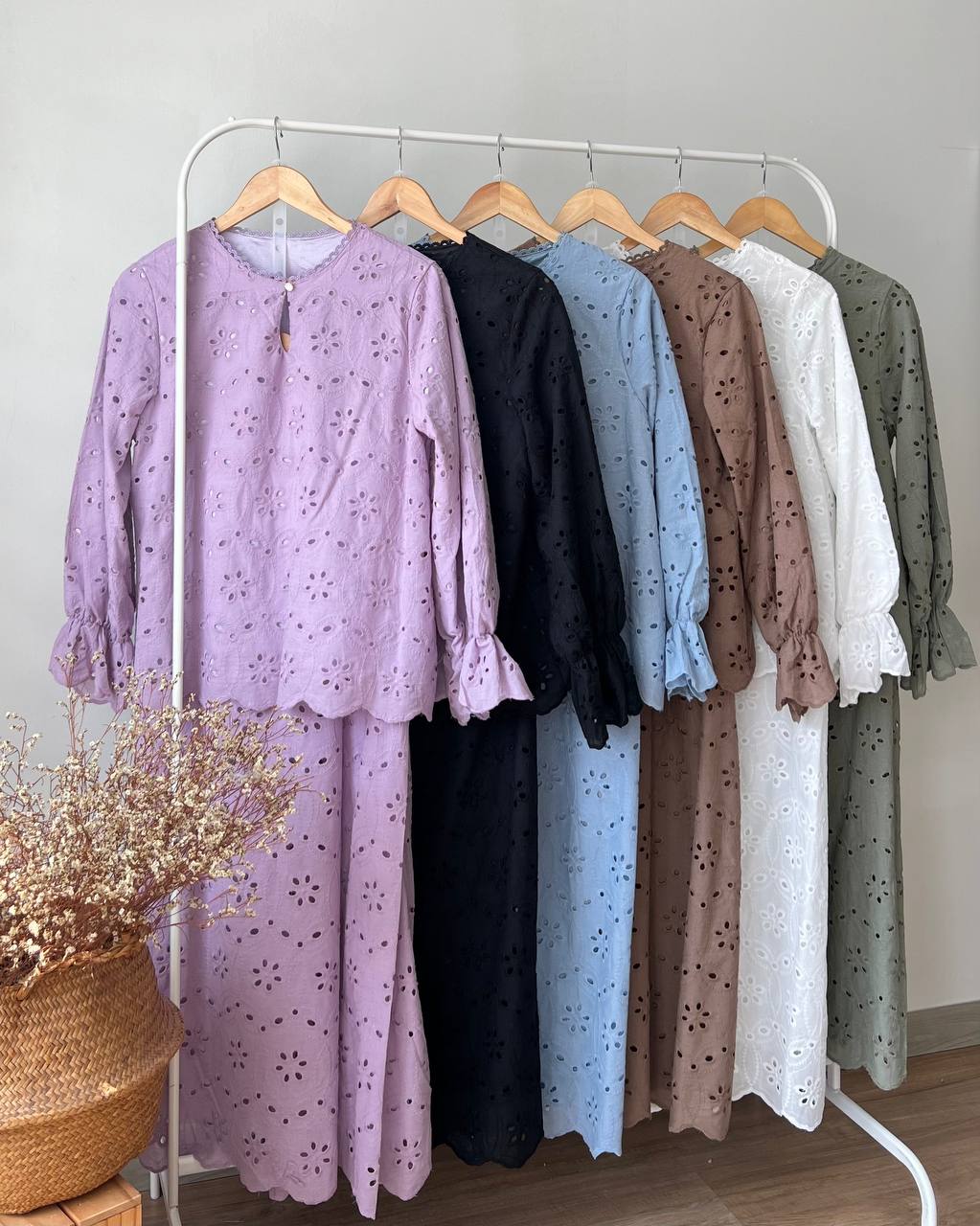 WHITE, DUSTY PURPLE, SOFT BLUE, DARK BROWN, OLIVE GREEN, BLACK